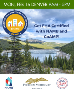 RegisterNAMB and CoAMP proudly presents the Certified FHA Mortgage Specialist (CFMP)! Sponsored by Freedom Mortgage. FHA loans have been helping people become homeowners since 1934. Having the ability to provide your borrower with the option of an FHA loan is a vital tool in your arsenal of lending options. Education offered as part of this session is similar…