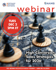RegisterJoin NAMB and the Weekly Roadmap for an informative webinar, “High-Conversion Sales Strategies for 2026: The Scripts, Systems & Psychology That Close More Loans“, on December 2, 2025 at 2:00 pm ET. Join Brian Hale, Founder & CEO of Mortgage Advisory Partners and creator of WeeklyroadMAP, for a high-impact session on the sales strategies that top producers…