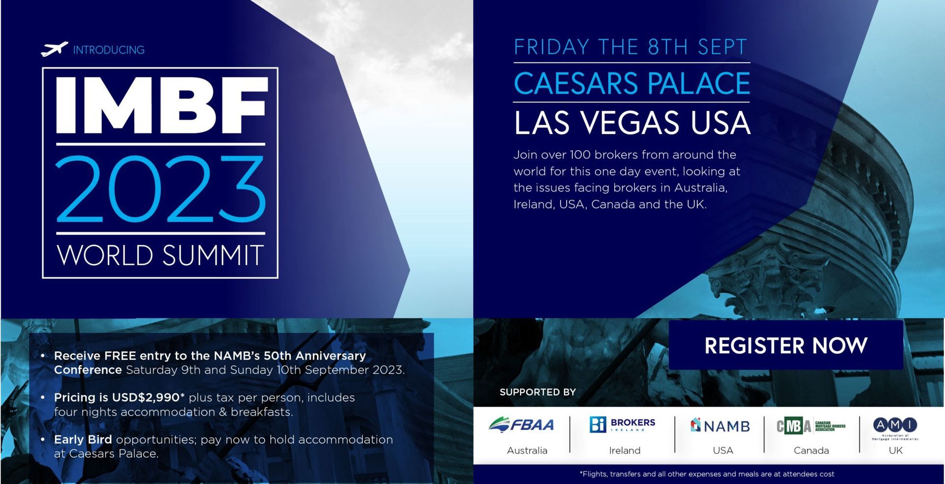 Welcome to the Inaugural IMBF World Summit 2023. Let’s do some great work while networking with colleagues from around the world in finance & mortgage brokering - gathered all in one place !